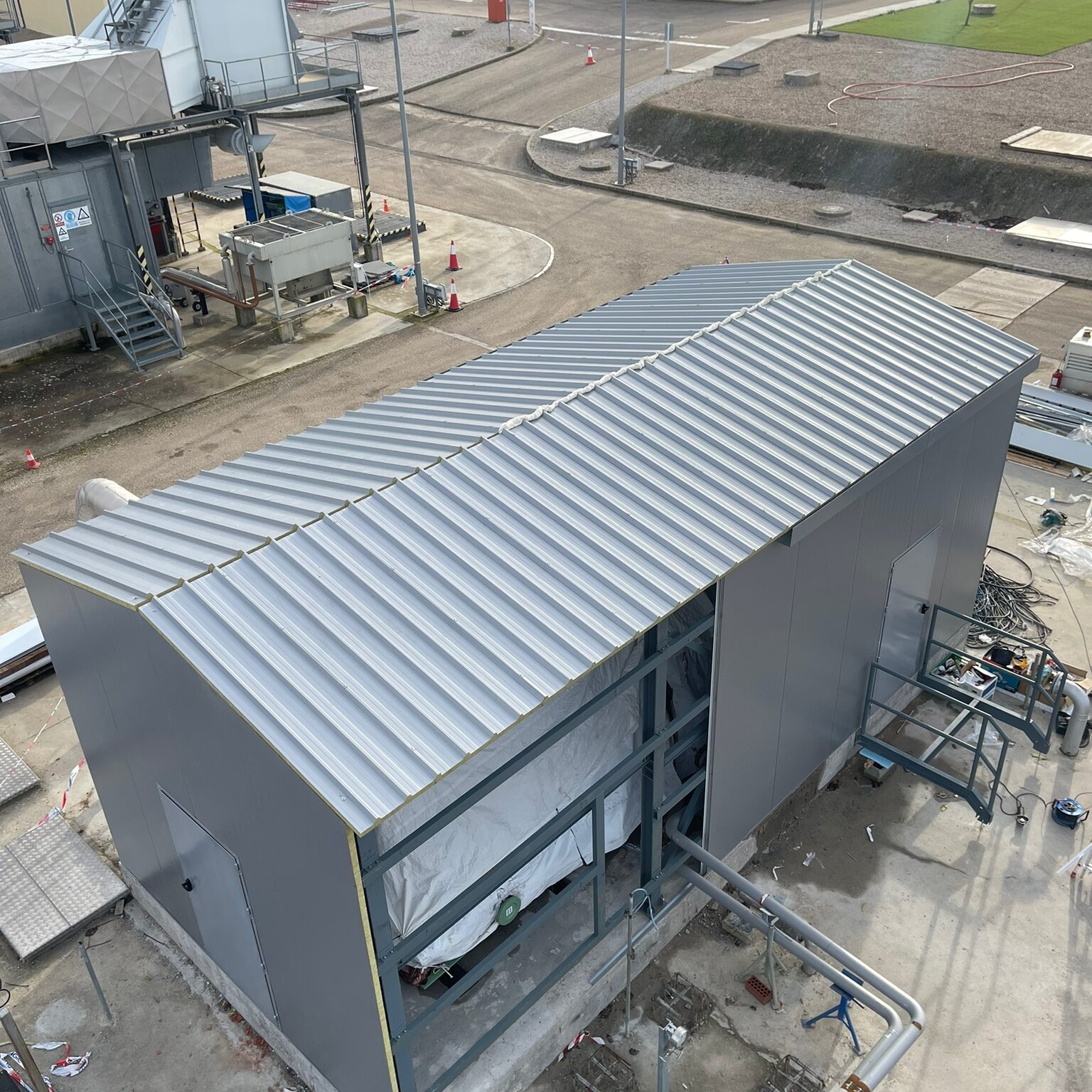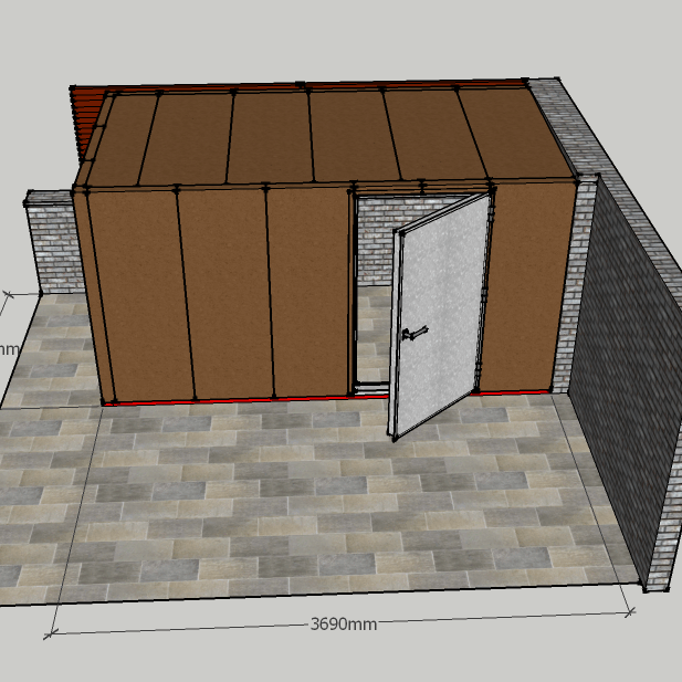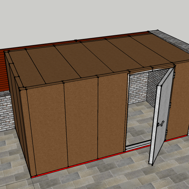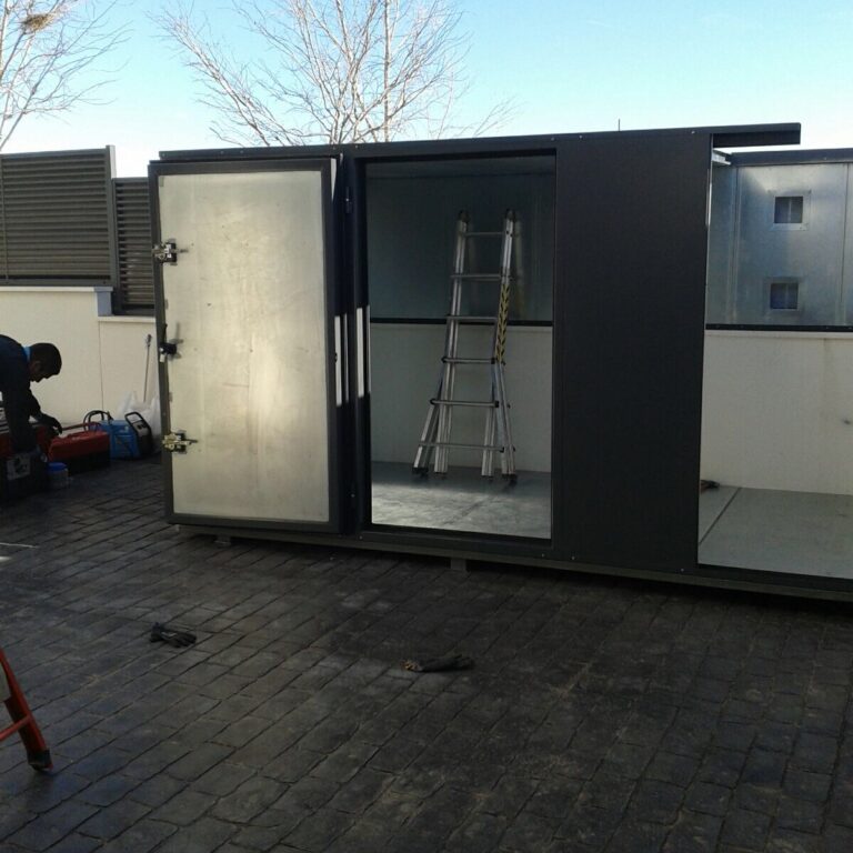 Está fabricada con paneles machihembrados fabricados por ambos lados en chapa lisa de acero de 2 mm de espesor con relleno interior en landa de roca de alta densidad (150 Kg/m3). Estructura elevada en suelo para evitar la filtración de agua, totalmente estanca.