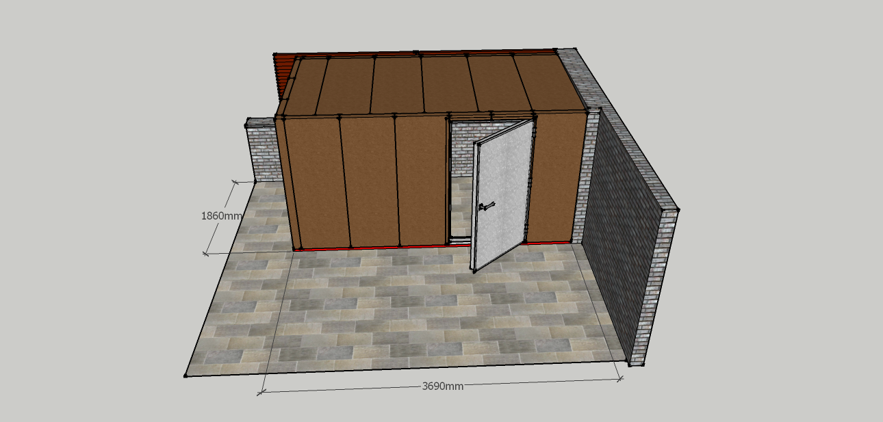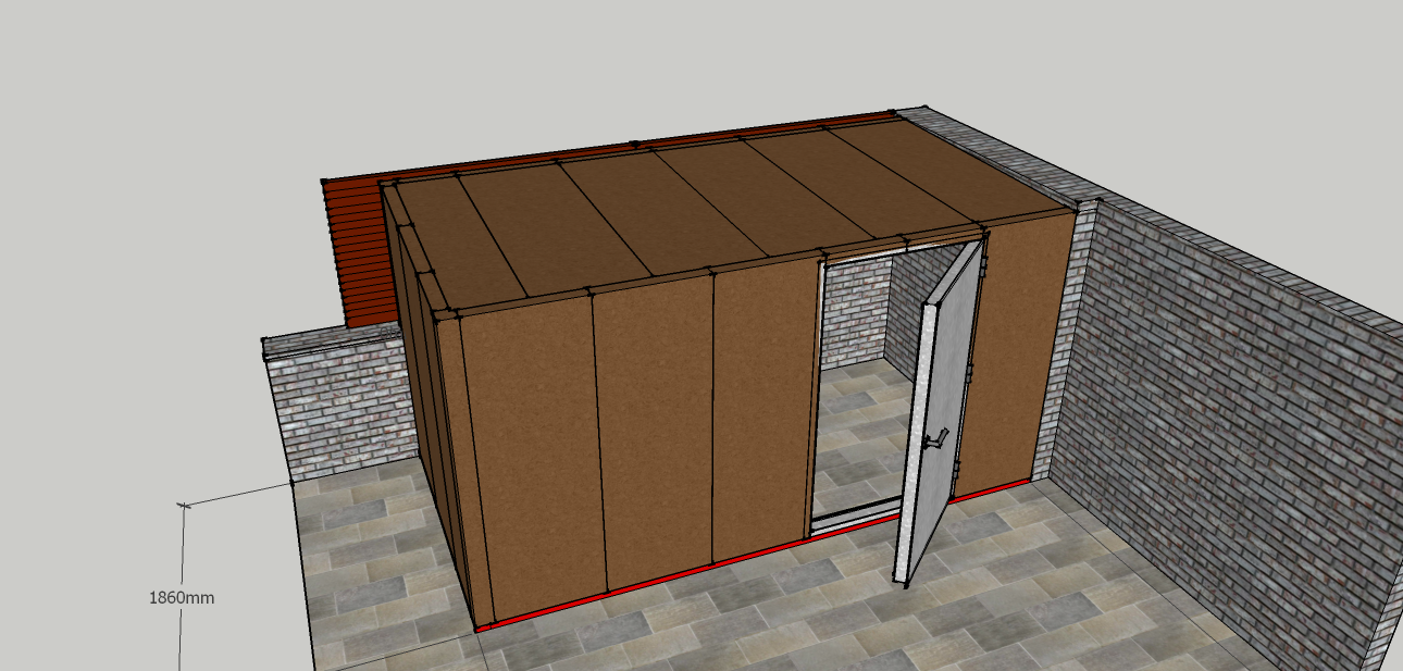 Está fabricada con paneles machihembrados fabricados por ambos lados en chapa lisa de acero de 2 mm de espesor con relleno interior en landa de roca de alta densidad (150 Kg/m3). Estructura elevada en suelo para evitar la filtración de agua, totalmente estanca.